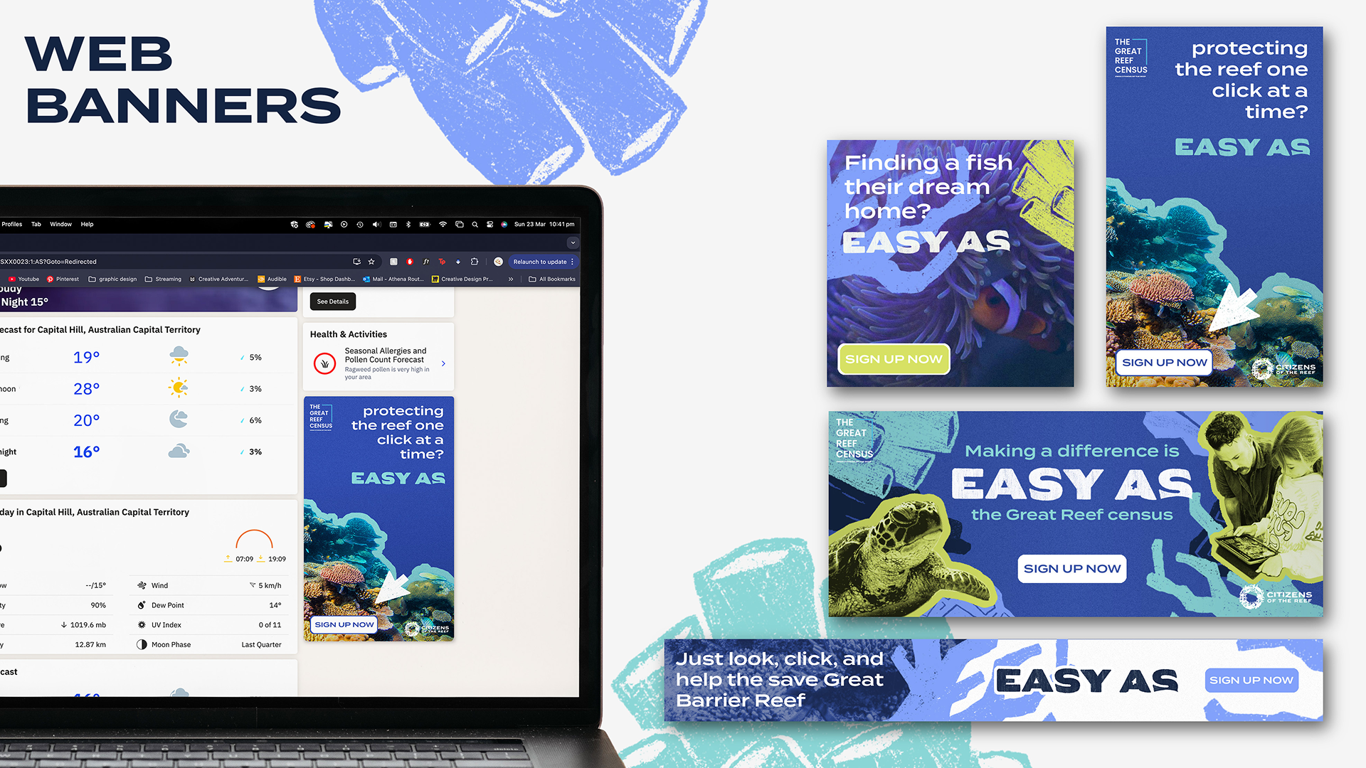 The visual identity drew from Citizens of the Reef branding, enhanced with vibrant coral tones and hand-drawn illustrations to make the campaign feel approachable, playful, and human.
