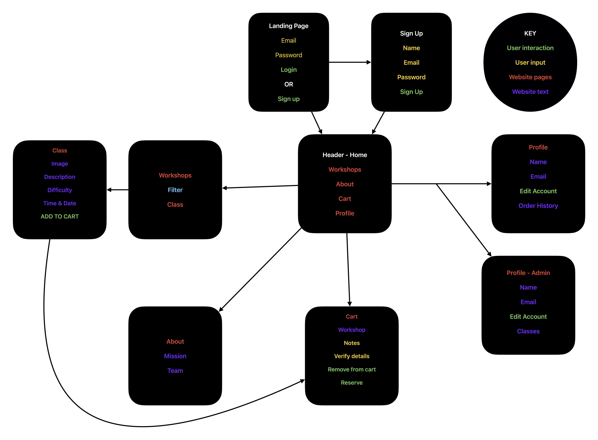 Information architecture provides a framework for organizing and structuring information in a way that serves both users and the business goals of your website or app. Here, the LVLY website requires users to sign in or create an account before they are able to view, book, and reschedule their desired workshops.
