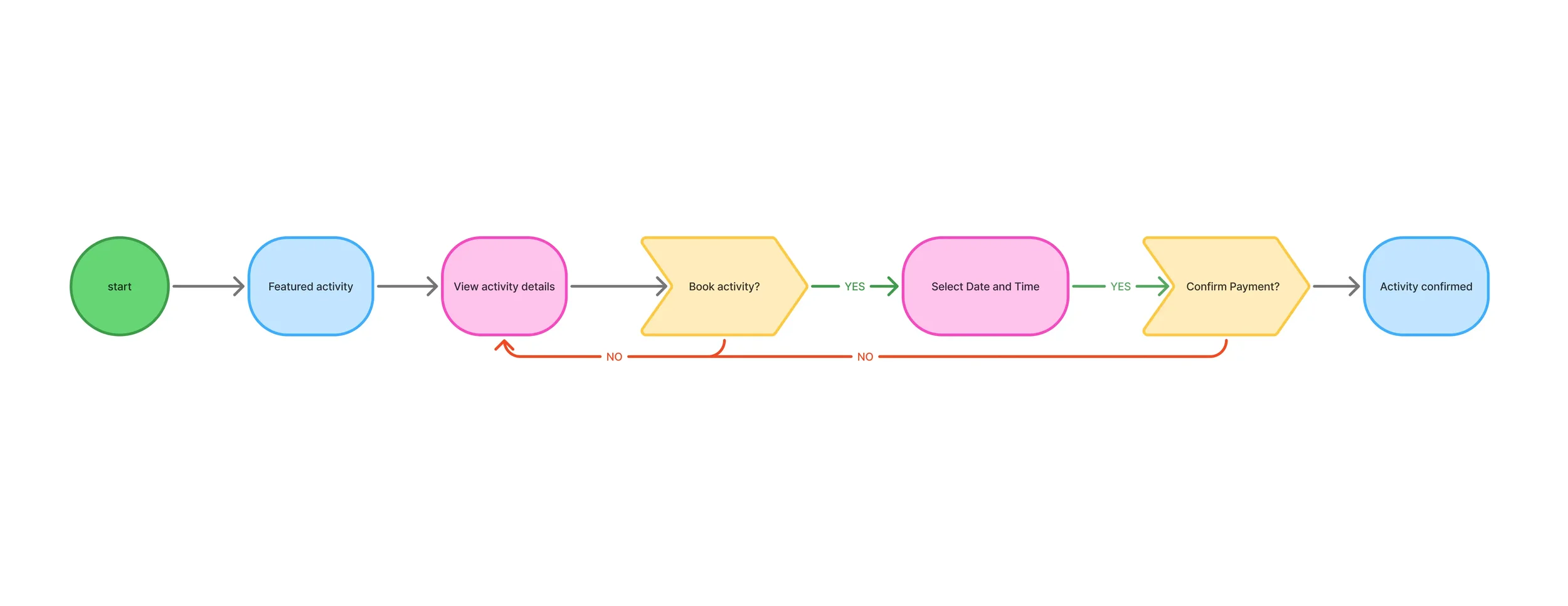 A basic user flow showing how a user may find an activity and book it in the app.