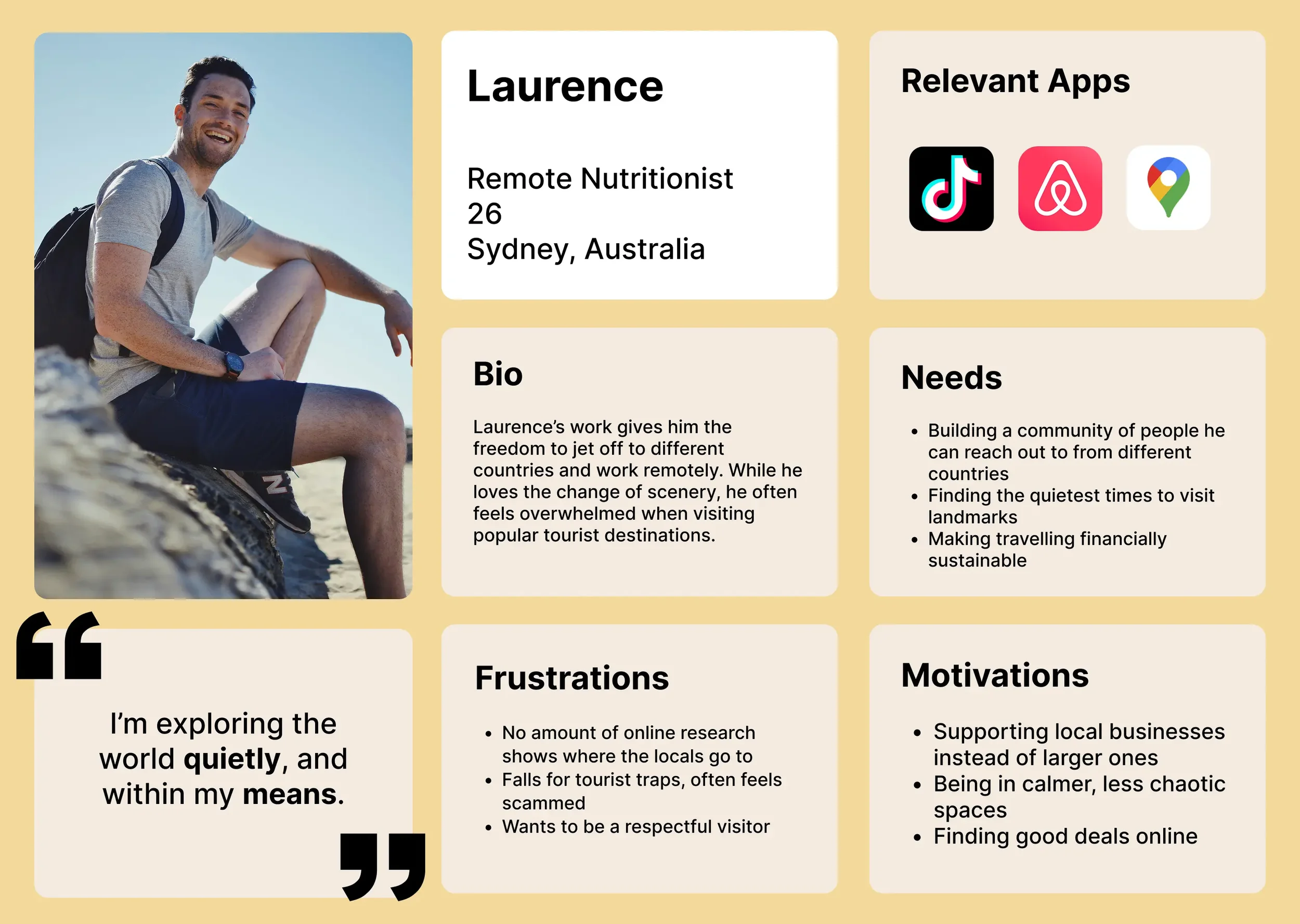 These travellers dislike large crowds and falling for hiked up tourist prices. These travellers usually spend more time looking through online guides and forums to find hidden gems, but struggles to find in-person recommendations through actual locals. These difficulties may be due to local businesses not being well advertised online. Their biggest roadblock is struggling to find quieter activities and places, and ending up in tourist traps.