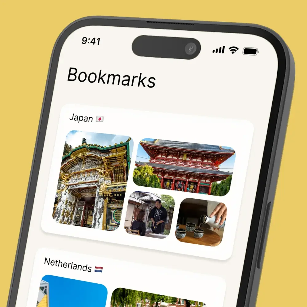 To support trip planning across multiple destinations, bookmark collections were added, allowing users to organise saved activities by country or trip.