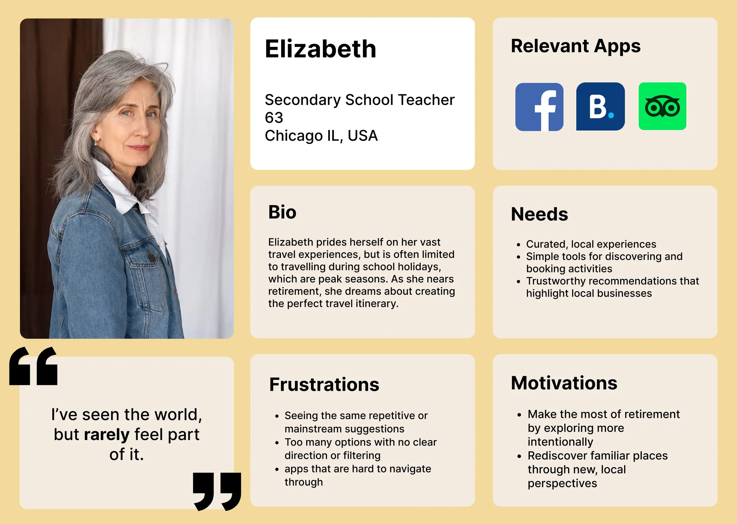 These travellers are experienced in travelling, but have often gone through cruises and guided tours that limit what they can see and do. These travellers struggle to find more authentic experiences as many of the activities and places are limited by word of mouth. Their biggest roadblock is not knowing where to look, or who to talk to for these local gems.